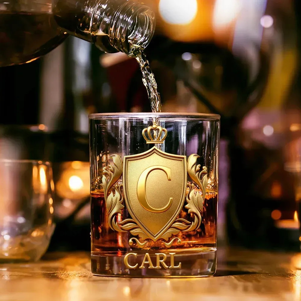 Die Whiskygläser mit Abzeichen können durch Eingravieren Ihrer Initialen und Ihres Namens personalisiert werden.